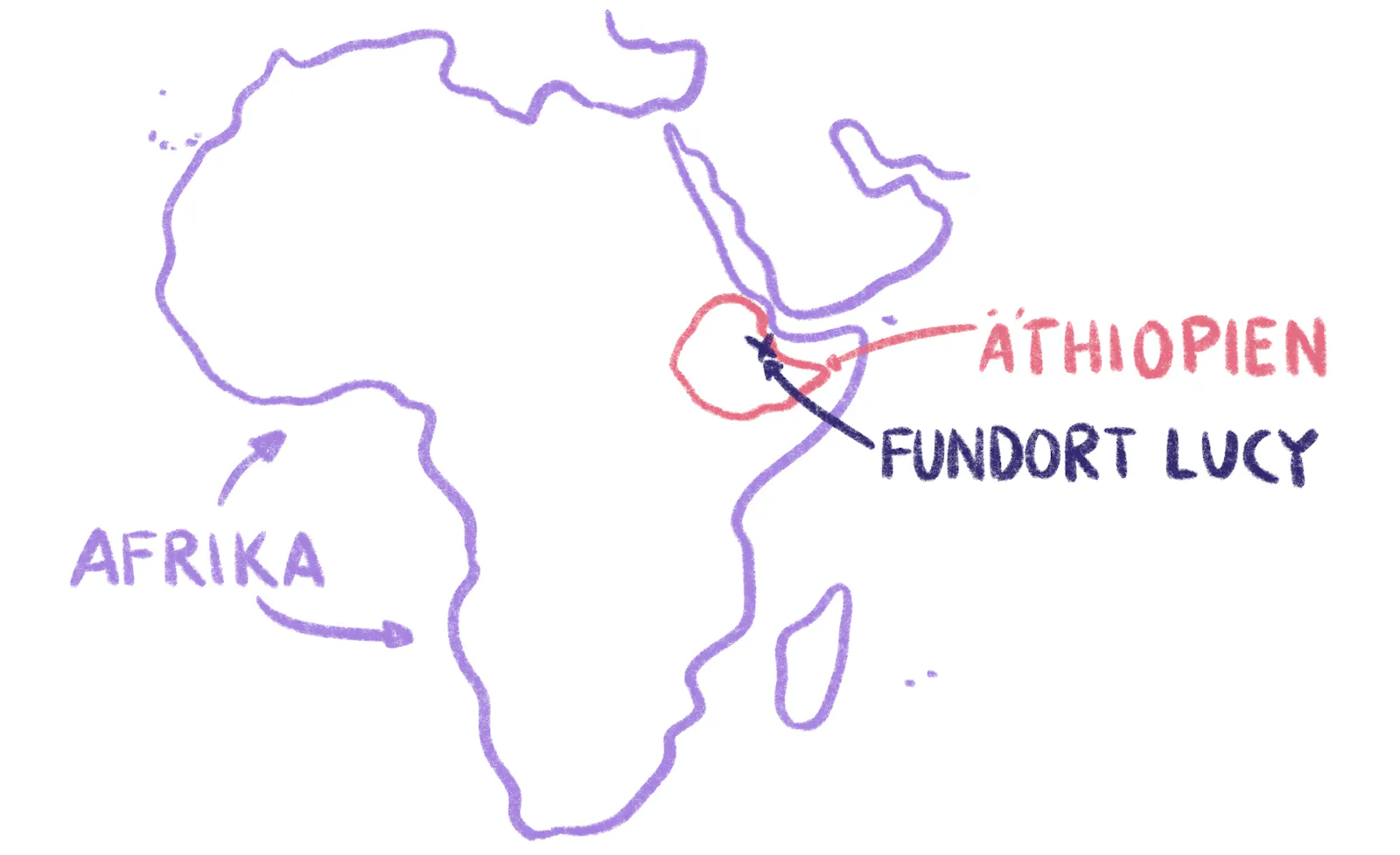 Hadar liegt im nordöstlichen Afar-Dreieck, einer geologisch spannenden Region, in der sich ursprĂŒnglich mal ein See befand. Vulkanasche, Sedimente und Schlamm haben sich hier im Laufe von Jahrmillionen Schicht um Schicht abgelagert. FĂŒr PalĂ€oanthropolog:innen ist diese Ecke eine Schatzkammer, denn starke RegenfĂ€lle â die hier selten, dann aber sehr heftig sind â können immer mal wieder neue Fossilien freispĂŒlen. Oft lassen sich einzelne Knochenfragmente sogar direkt an der OberflĂ€che finden. So auch an jenem Tag: Donald Johanson kniete ĂŒber einem kleinen Fragment im Geröll, als Tom Gray zunĂ€chst meinte, es handle sich wohl um die Ăberreste eines affenĂ€hnlichen Tieres. Doch dann entdeckten sie in unmittelbarer NĂ€he ein StĂŒck SchĂ€del, ein HĂŒftfragment, einen Oberschenkelknochen â und es wurde schnell klar, dass das hier kein Pavian, Schimpanse oder Ă€hnliches sein konnte. Je lĂ€nger sie suchten, desto mehr Knochenfragmente kamen zum Vorschein. Nach wenigen Minuten war ihnen klar: Vor ihnen lag eine Sensation.