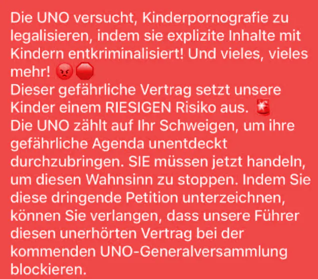 Diese Kettenbriefe verbreiten sich wie ein Lauffeuer, und viele Nutzer*innen teilen den Unsinn einfach weiter, ohne auch nur eine Sekunde darüber nachzudenken. Eine einfache Recherche hätte gereicht, um die Wahrheit zu erkennen: Die UNO-Cybercrime-Konvention soll Kinderpornografie weltweit bekämpfen, nicht legalisieren!