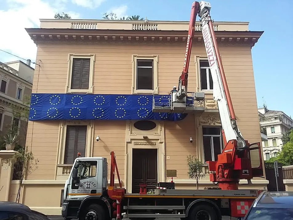 To symbolise the solidarity of European citizens with Ukraine under the bombs, our partner organisation EuropaNow! is embracing the Ukrainian embassy: on 9 May, more than 50 blue starred metres, made up of about 150 EU flags, will wrap the building of the diplomatic residence in Via Guido D'Arezzo, Rome.