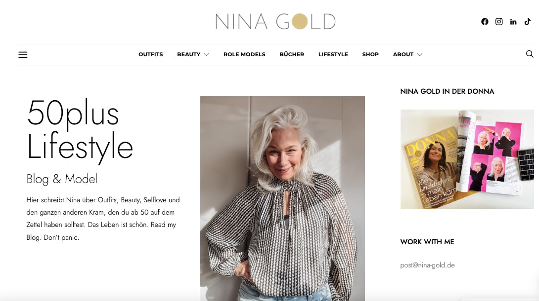 NINA GOLD (Opens in a new window) ist das Projekt von Nina Goldhammer (Opens in a new window), Jahrgang 1971, Optimistin, Autorin, Bloggerin und Bestager Model, ein Mensch der der klaren Worte und heute in allen erdenklichen Wortbedeutungen um einiges cooler als ihr 30jähriges Ich.