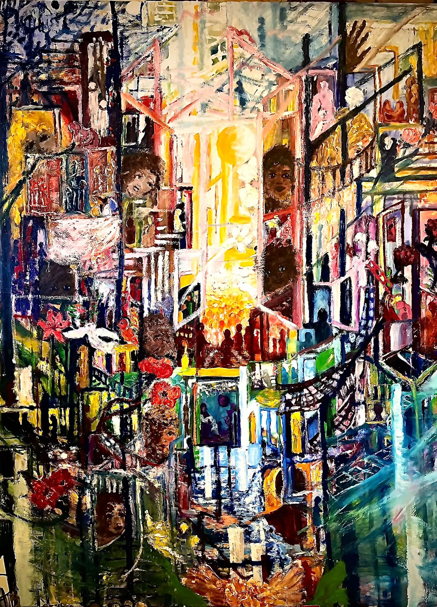 https://karinafinkenau.de/ (Opens in a new window)Das Bild ÜberLebensRaum (s.o.) von Karina Finkenau (Opens in a new window) zeigt so viele kleine Fenster, in denen es etwas zu entdecken gibt. Jedes für sich ein Schatz, der im Bild verborgen ist, den es zu erspähen und zu bergen gilt. Jedes Detail erzählt wiederum eine ganze Geschichte und könnte herausgezoomt und vergrößert und als in sich vollkommenes Bild betrachtet werden.