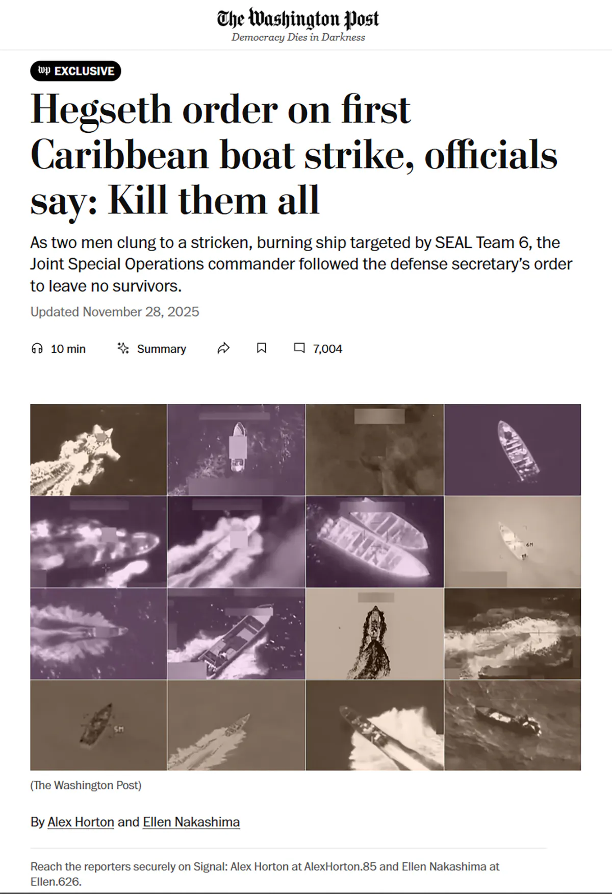 Laut mehreren Zeugen hat der Kriegsminister Peter Hegseth mündlich den Befehl gegeben, sie alle zu töten. Gemeint waren die Drogenschmuggler. Das ist so viel wie „keine Gefangenen“.