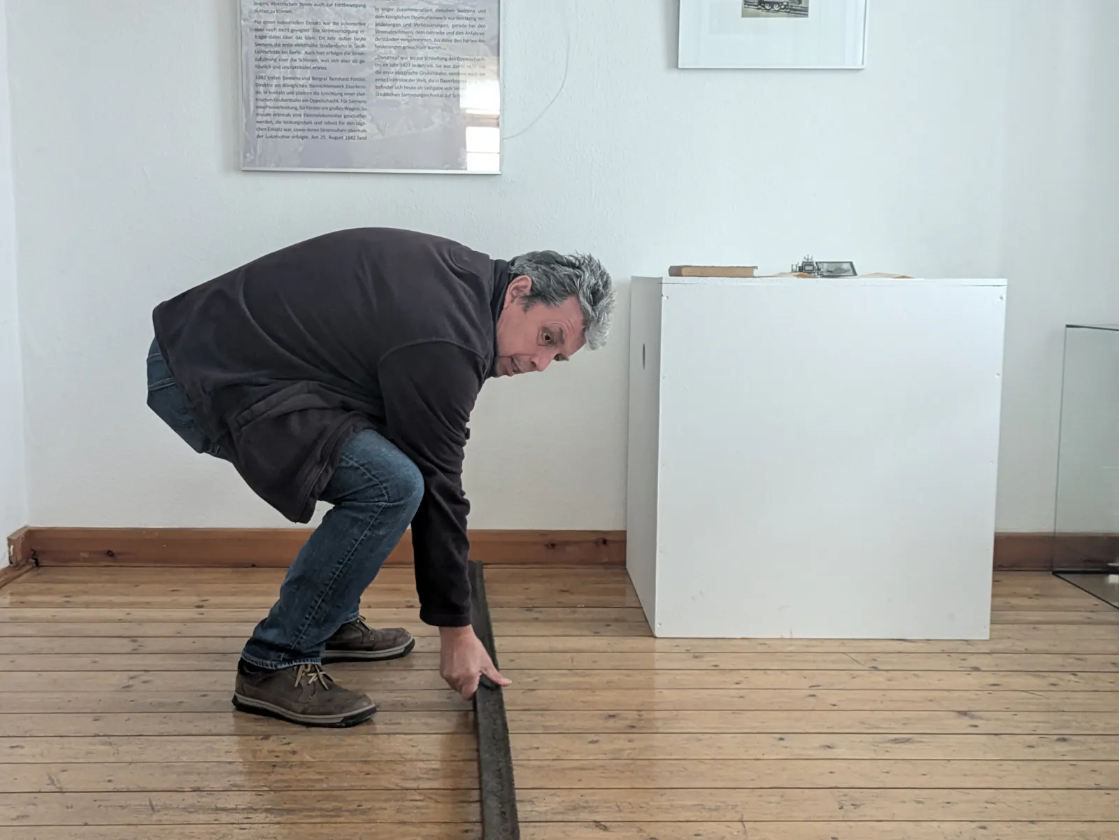 Wieland Büttner zeigt die Schiene der ersten E-Lok im Oppelschacht.