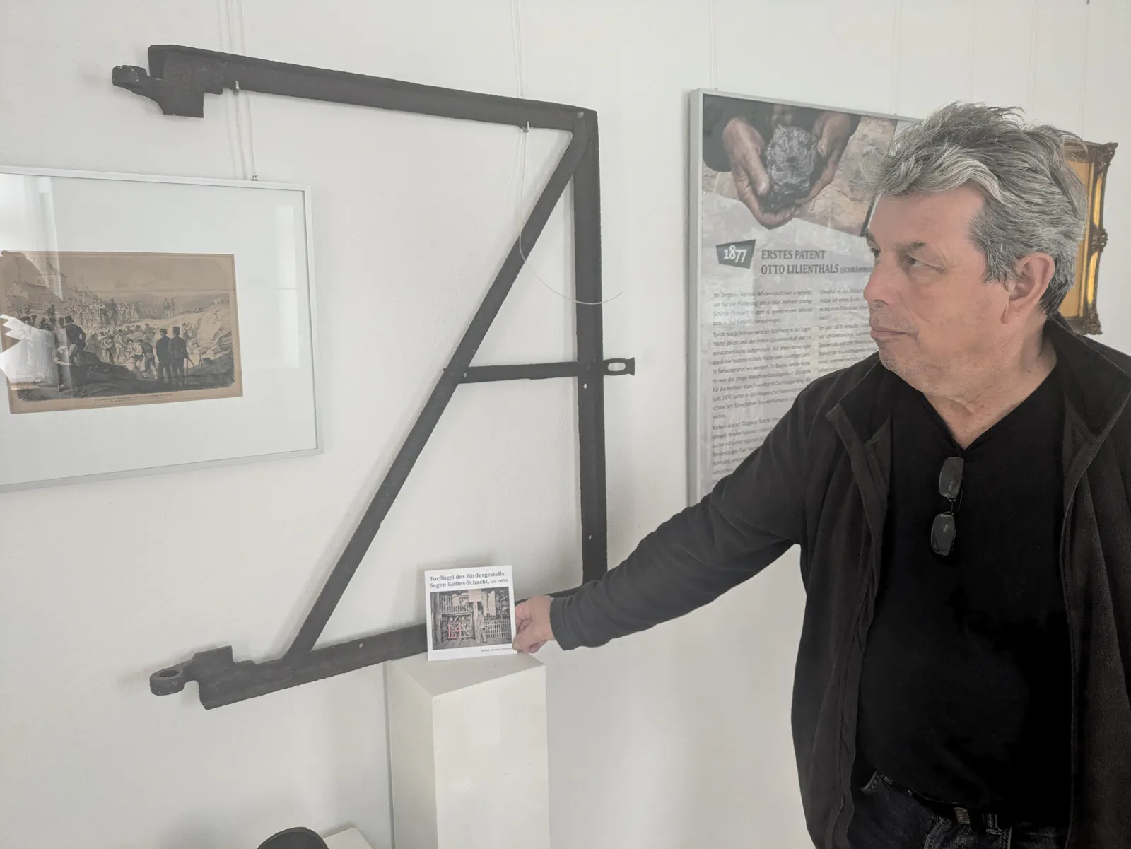 Wieland Büttner und der Torflügel des Unglücksschachtes.