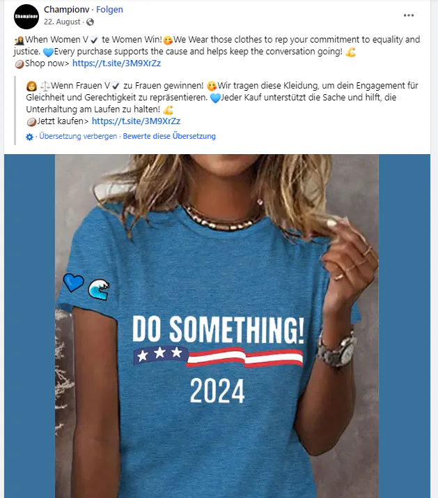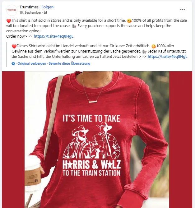 Das Ganze funktioniert so: Die chinesische Firma 广州时维网络科技有限公司 (Guangzhou Shivei Network Technology Co., Ltd) postet Tausende Anzeigen, die alle nur eines versprechen: „100% der Erlöse gehen an politische Kampagnen.“ T-Shirts für Trump oder Harris, je nach Zielgruppe, und das vermeintliche Geld soll in politische Kampagnen gesteckt werden – etwas, was US-Bürger und Facebook-Nutzer gleichermaßen anlocken soll. Aber jetzt mal ehrlich, wer glaubt ernsthaft, dass dieses Unternehmen aus China wirklich auch nur einen Cent spendet?