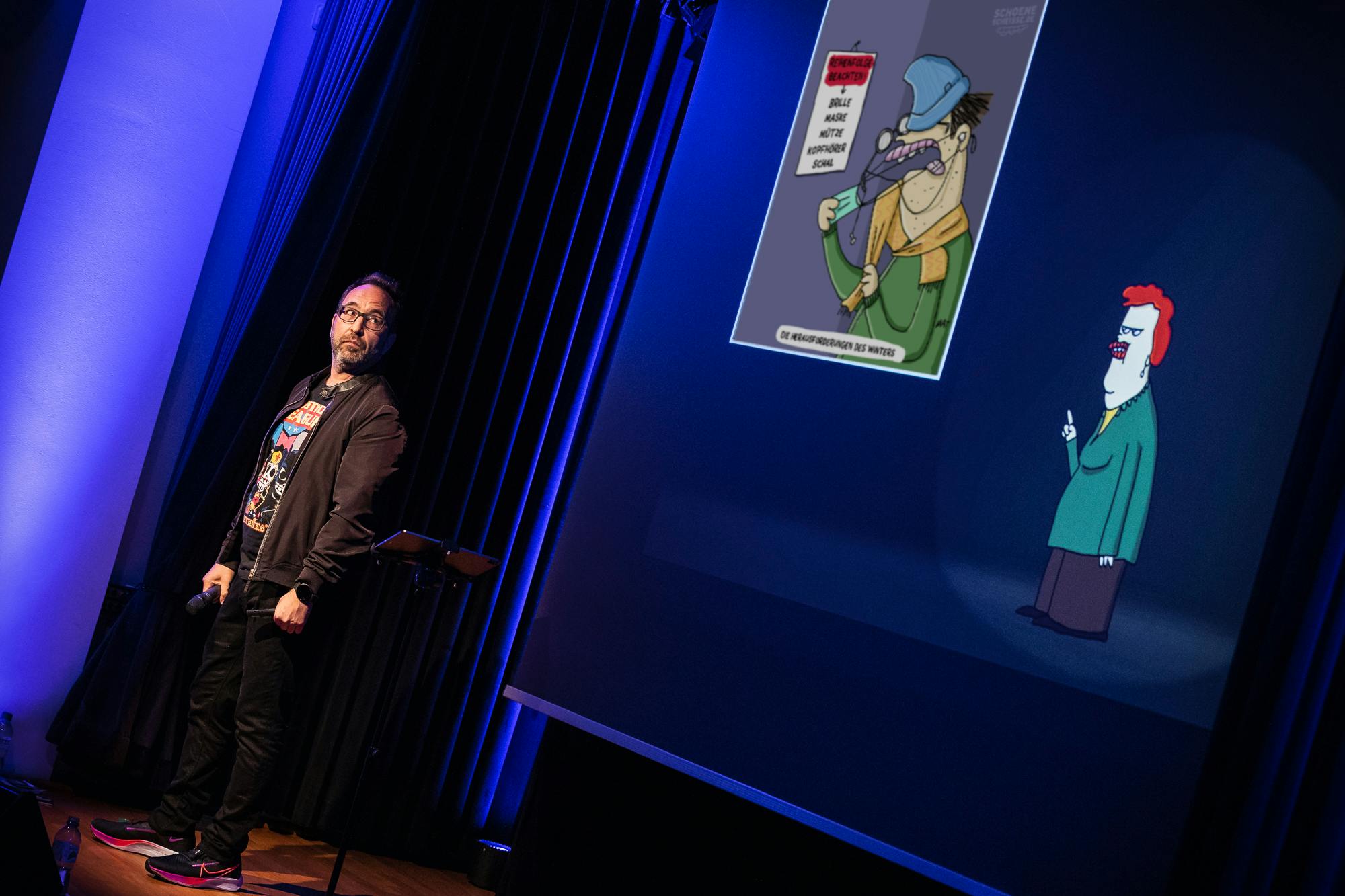 Und so fing es an: Als ich 2014 in Kassel mit einer kleinen Cartoon-Show im Rahmen einer Ausstellung startete, hätte ich nicht gedacht, dass es eines Tages mein Hauptjob wird, mit einer abendfüllenden Show (aktuell: "Halt die Fresse, Rapunzel!") durch Deutschland zu touren. Ich war mit Teilen davon schon in Österreich, der Schweiz und sogar auf dem Roten Meer!