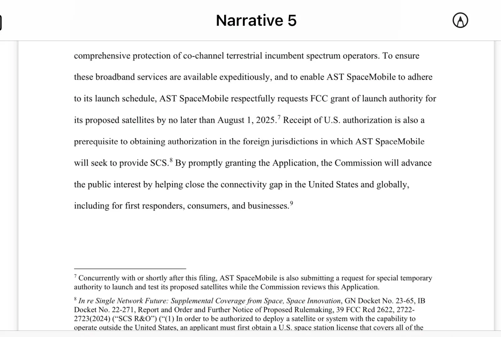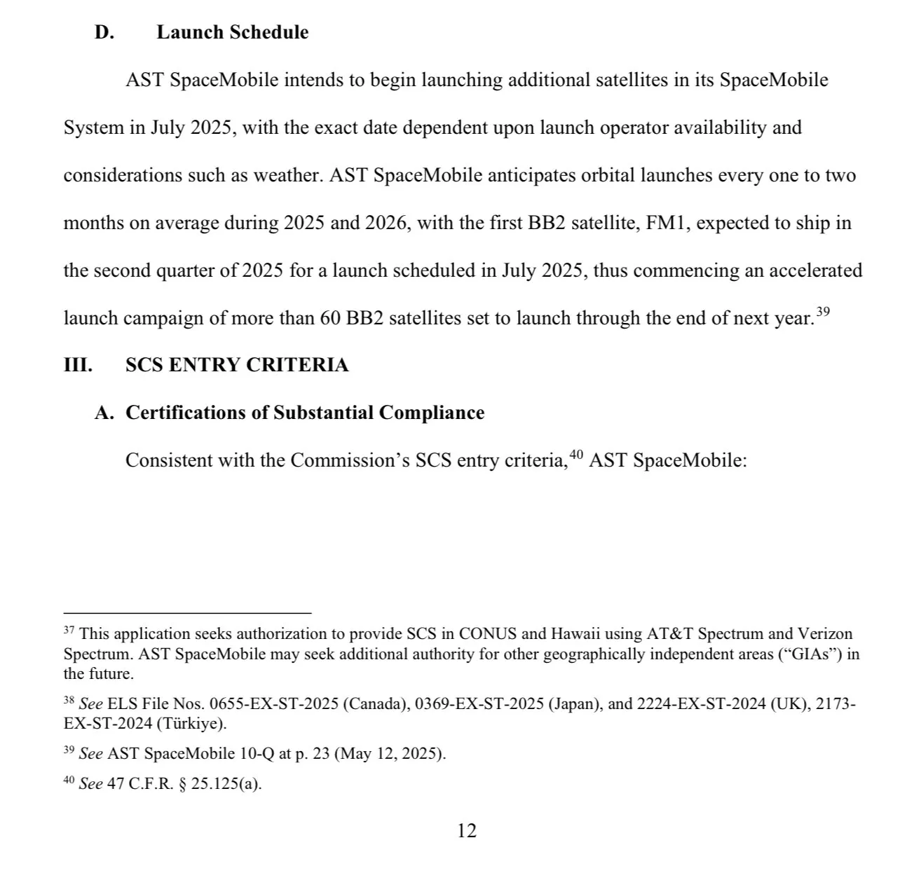 In einer Fußnote wird darauf hingewiesen, dass parallel zum Hauptantrag ein Antrag auf eine Spezialvorab-Genehmigung (Special Temporary Authority) eingereicht wird, um bereits Teststarts der Satelliten durchführen zu können, während die FCC den Gesamtantrag prüft. AST SpaceMobile bittet um die Erteilung der Lizenz spätestens bis zum 1. August 2025. Damit steht die Kommerzialisierung kurz bevor.