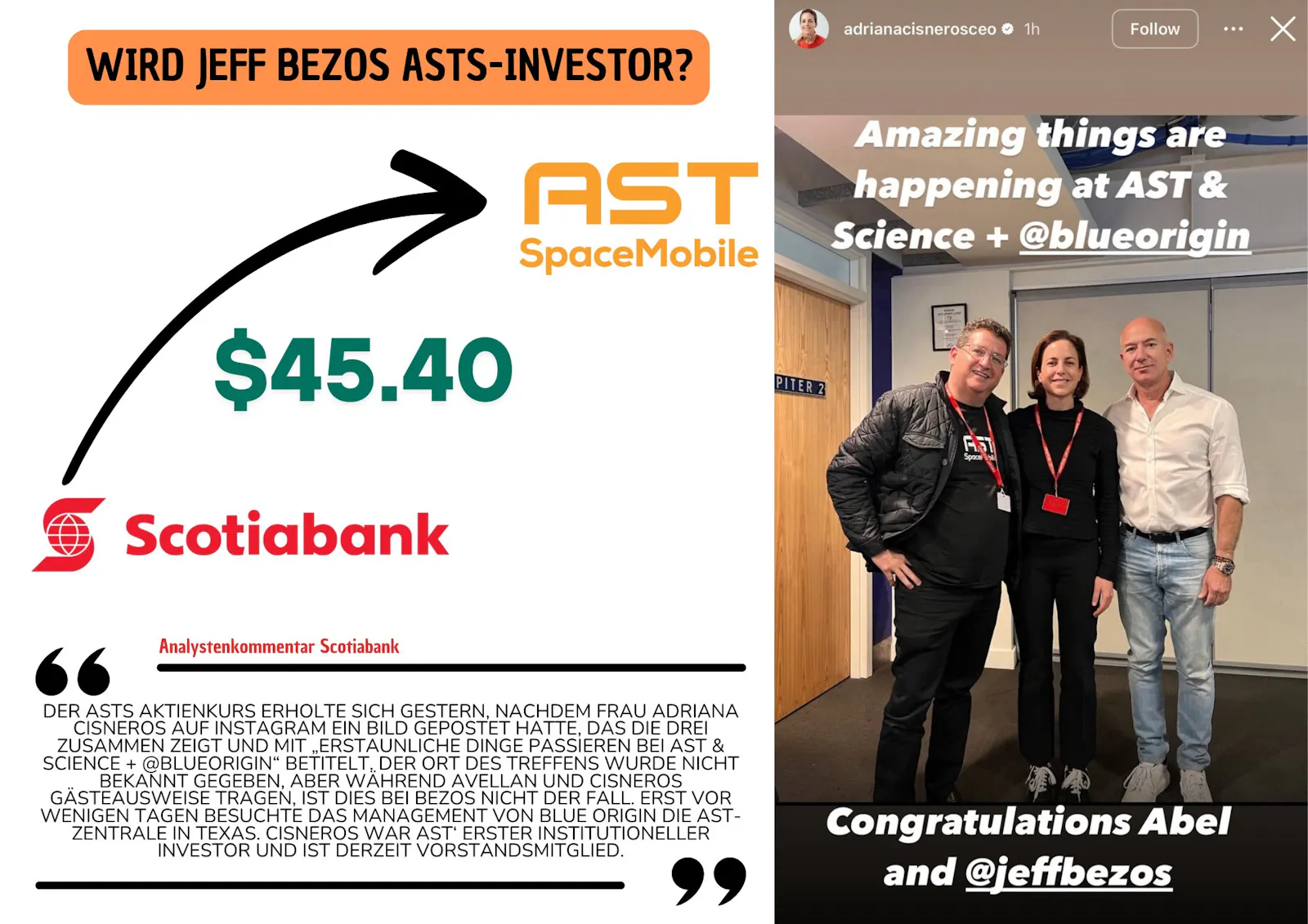 Es begann am 4. Juni: die Scotiabank bekräftigte die Outperformance des Sektors bei AST SpaceMobile, behielt das Kursziel bei $45,40 US-Dollar bei und spekulierte, dass Jeff Bezos bald ein Investor bei AST SpaceMobile werden könnte.
