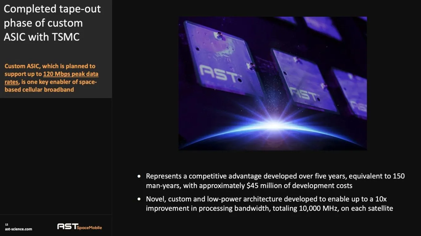 Die Chips sind auf niedrigen Stromverbrauch und hohe Leistung optimiert, was für den Betrieb im Weltraum, wo Energie und Gewicht entscheidende Faktoren sind, unerlässlich ist. Sie verfügen außerdem über Hochgeschwindigkeitsfunktionen für eine effiziente Datenübertragung. Der AST5000 ASIC erhöht die Verarbeitungsbandbreite pro Satellit um das Zehnfache. Durch die Integration dieser ASICs können die BlueBird-Satelliten künftig eine Verarbeitungsbandbreite von bis zu 10.000 MHz pro Satellit unterstützen. Der AST5000 ASIC ermöglicht zudem Spitzendatengeschwindigkeiten von bis zu 120 Megabit pro Sekunde (Mbit/s). Diese Geschwindigkeiten ermöglichen neben einfachen Textnachrichten Sprach- und Videoanrufe, SMS und Streaming.