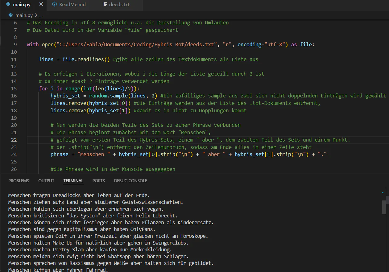 Der erste ist der HybrisBot. Augenscheinliche Widersprüchlichkeit wird im Internet gern dazu benutzt, die moralische Korrumpiertheit des Gegenübers zu betonen: „Du bist für Klimaschutz aber trägst Schuhe?! Weißt du nicht wie schädlich das ist?!“ oder „Du bist gegen den Kapitalismus aber KAUFST DINGE?!“ Diese und andere unproduktive Diskussionsstrategien finde ich äußerst nervig. Daher habe ich einen Bot geschrieben, der ganz viele solcher Sätze generiert, damit wir das nicht mehr machen müssen. Der HybrisBot ist ein sehr simples Programm, das Sätze nach dem Schema „Menschen machen/sagen/… A, aber machen/sagen/… B“ generiert.