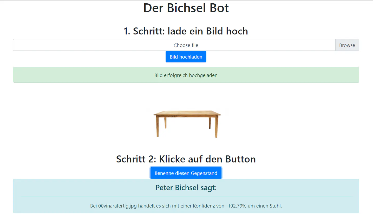 Damit so ein Schicksal für Menschen zu vermeiden, habe ich den Bichsel Bot gebaut. Im Zentrum steht ein Image-Classifier. Also ein Programm, das mit Machine Learning dazu gebracht wurde Tische als Stühle und Stühle als Tische zu erkennen. Sobald ich mehr Trainingsdaten habe für alle anderen Objekte, die in Bichsels Text vorkommen, werde ich das Projekt nochmal weiterführen.