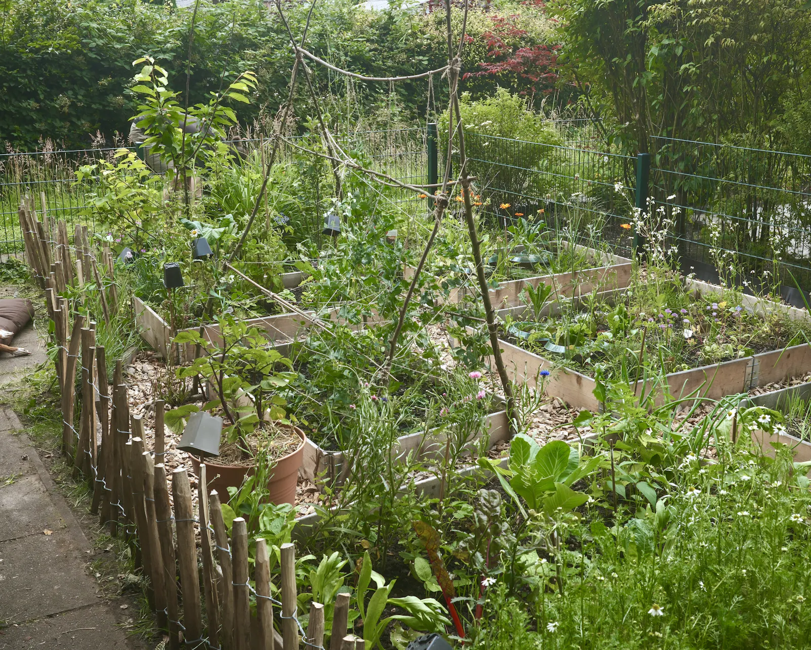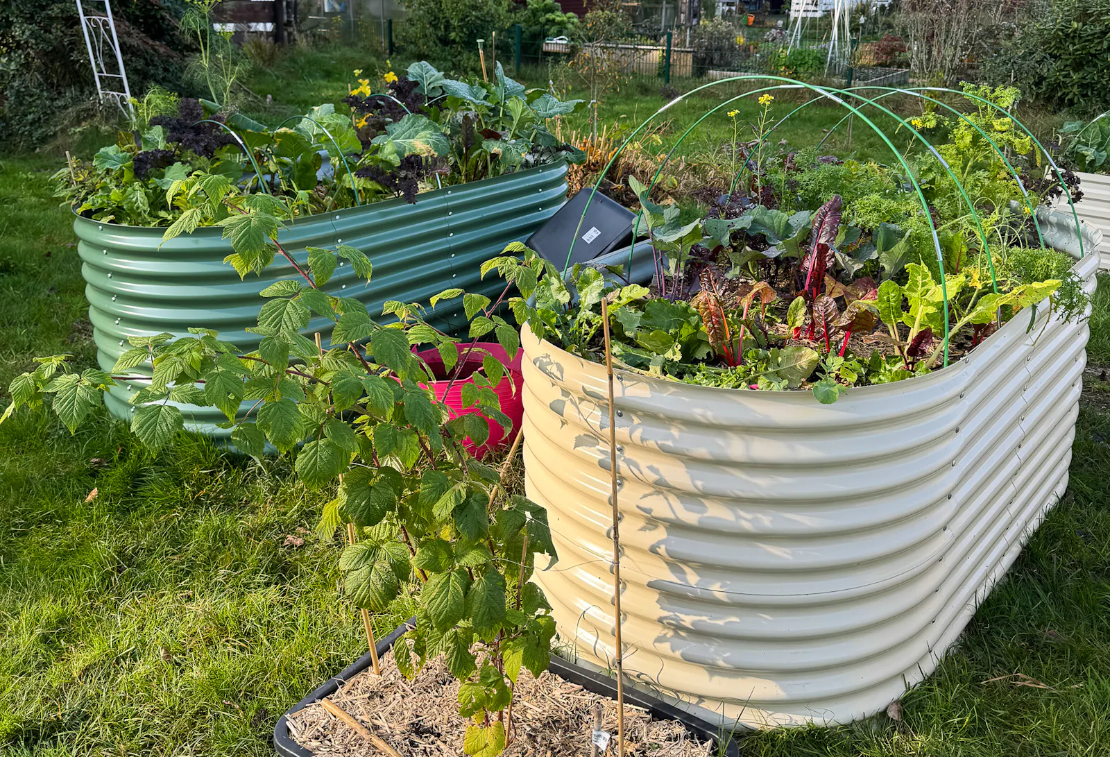 Da meine Gärten leider regelmäßig Besuch von Massen (!) an Schnecken, Wühlmäusen und Kaninchen bekommen, gärtnere ich ausschließlich in Hochbeeten, die meistens einen Meter hoch sind. Die meisten sind aus Metall (die Schnecken mögen das nicht so gern, also da am aufgeheizten Metall hoch, uff neeee). So bleiben meine Pflanzen gut geschützt, und gleichzeitig sind die Hochbeete für mich ergonomisch bequem. Im Waldgarten habe ich auch ein paar Palettenbeete, die sind dann nur 30 cm hoch. Da ich darunter Wühlmausdraht habe, pflanze ich dort nur Flachwurzler.