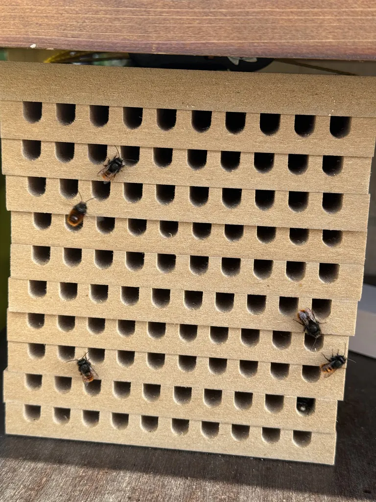 Unterschiedliche Wildbienenarten bevorzugen unterschiedliche Durchmesser: Für die Gehörnte Mauerbiene eignen sich Löcher mit etwa 9 mm, für die Rote Mauerbiene etwa 8 mm. Generell deckst du mit Bohrlochgrößen zwischen 3 und 9 mm die meisten Arten gut ab. Bohre tief genug, aber nicht komplett durch das Holz, sodass nicht an einem Ende plötzlich eine Öffnung ist.