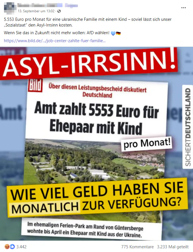 Die Meinung, dass ukrainische oder andere Nationalitäten höhere Leistungen erhalten, entspricht nicht der Wahrheit. Gerade in den genannten Unterbringungsformen wie Gemeinschaftseinrichtungen werden Beträge im Bescheid gegenüber den betroffenen Personen zwar bewilligt, die Zahlung selbst erfolgt jedoch differenziert. Die Kosten der Unterkunft und Heizung werden an den Träger gezahlt, der diese Dienstleistung vorhält z. B. der Landkreis/ die Kommunen. Die betroffenen Familien bekommen in der Regel lediglich die gesetzlich ausgewiesene Regelleistung ausgezahlt. Dies wird in den Bewilligungsbescheiden auf den Folgeseiten auch differenziert dargestellt.