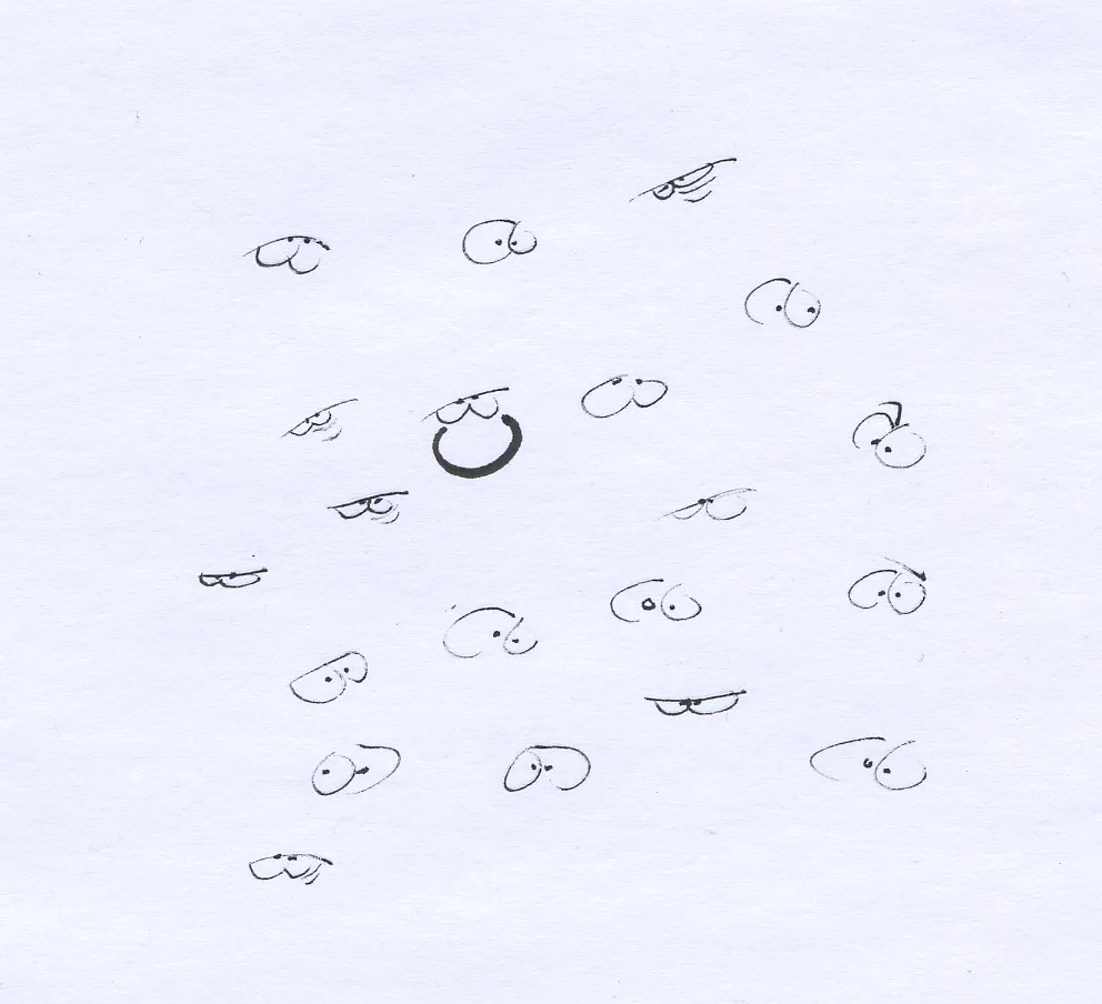 1:1 zu zeichnen hat auch wegen der Strichstärke des Tusche- Fineliners Vorteile. Mit sanftem Druck kann ich die variieren, erst recht, wenn der Stift nicht mehr ganz voll ist und die Miene schon etwas Gebrauchsfolgen aufweist. Überhaupt ‚tänzelt‘ meine Hand beim tuschen übers Papier, mal mit mehr, mal mit weniger Druck, einige Linien lasse ich teilweise sogar ganz weg, die sind dann nicht geschlossen, ich kann nicht sagen, warum. Die Zeichnungen werden dadurch luftiger und wirken nicht so statisch. (Es ist übrigens auch für mich interessant, das mal aufzuschreiben, denn diese Vorgänge laufen oft unbewusst.) Ich bevorzuge halbvolle Stifte, damit lässt sich viel feiner arbeiten. Die Miene hat sich meistens an einer Seite abgenutzt, das heißt, auf der Kante ist der Strich sehr fein, auf der abgenutzten Seite dicker. Besonders wichtig ist mir das bei den Augen! Mit denen fange ich immer an, das ist das erste, denn gehen die schief, gleich nochmal und nochmal, bis der Ausdruck erreicht ist, der mir vorschwebt. Das ist ein blitzschneller Fingerschwung, der zum Glück aus Routine meistens sofort sitzt, aber auch einiges an Zufall bereit hält. Der Strich der Augen ist immer viel dünner als zum Beispiel der der Nasen, da nehme ich den Edding Profipen 01, für die Nasen den 07. Und besonders hier sind mir fast leere Stifte was wert! Der Strich muss wirklich sehr, sehr fein sein, sonst sieht es aus, als hätte Paul sich die Wimpern getuscht. Leider kann ich die Fineliner nicht schon benutzt zum halben Preis kaufen.