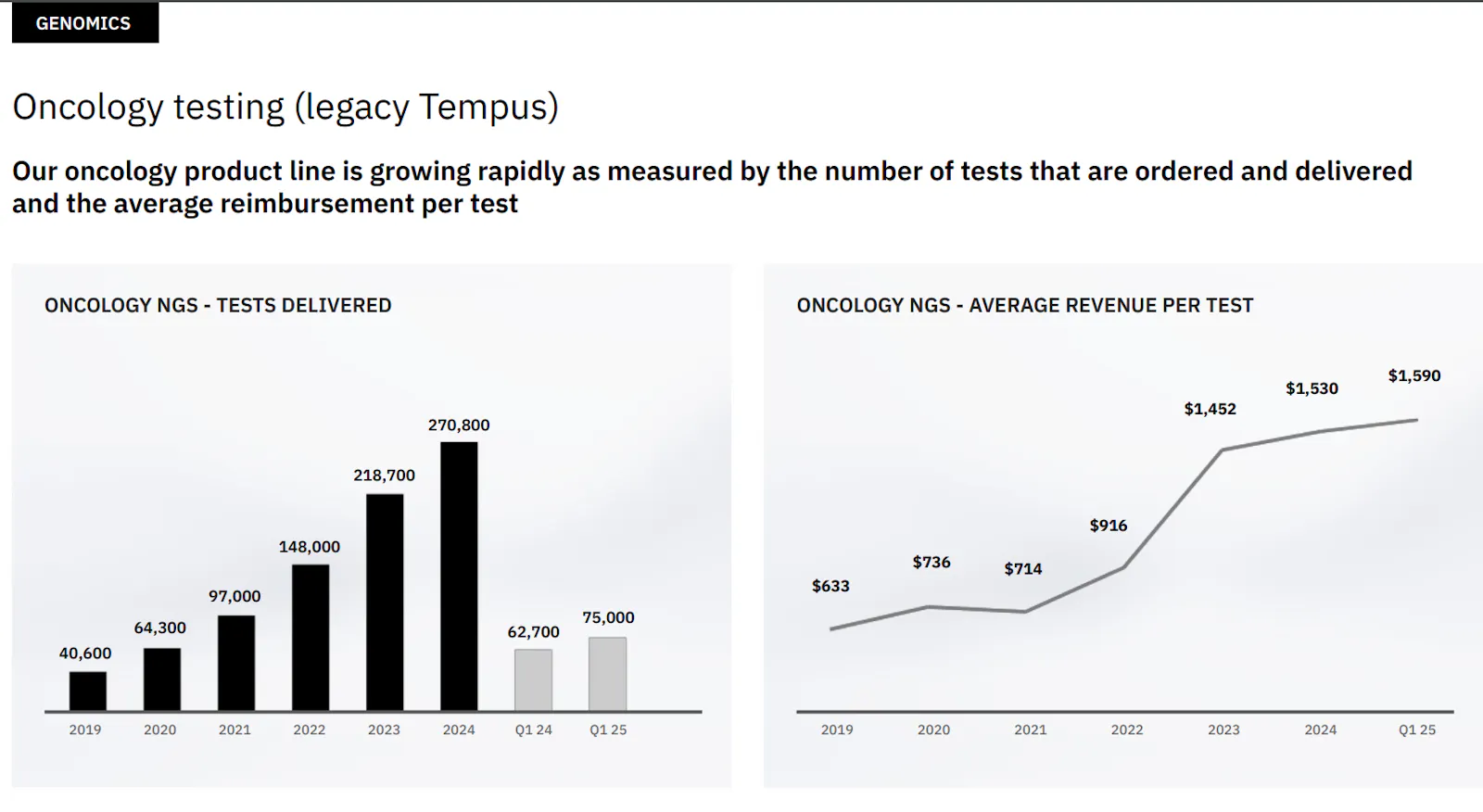Die Onkologie-Testlinie von Tempus AI entwickelt sich rasant, sowohl hinsichtlich der gelieferten Testmengen als auch beim durchschnittlichen Ertrag pro Test. Dies unterstreicht das starke Wachstum und die zunehmende Bedeutung der molekulargenetischen Krebsdiagnostik innerhalb des Unternehmens.