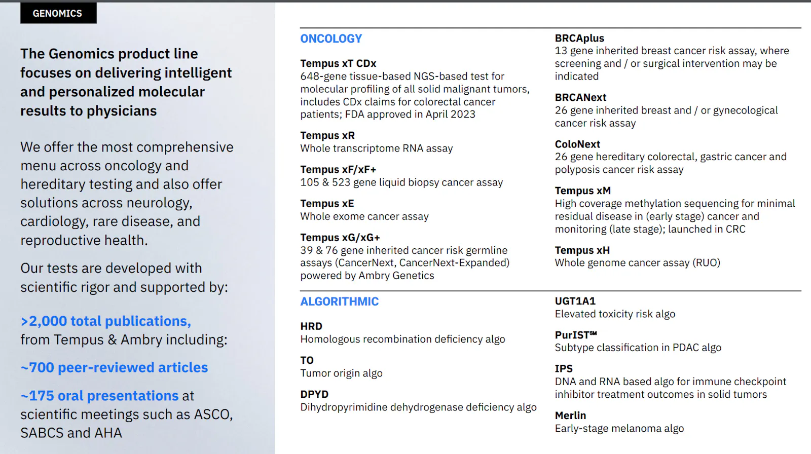 Im Bereich Genomik kündigte Tempus AI eine Kooperation mit Illumina an. Ziel ist es, KI-Technologien mit der multimodalen Datenplattform von Tempus AI zu kombinieren, um genomische Algorithmen zu trainieren und die klinische Nutzung molekularer Tests zu beschleunigen. Außerdem wurde das xT CDx-Gerät, ein von der FDA zugelassener NGS-basierter Diagnostiktest, landesweit eingeführt – mit einem etablierten Erstattungspreis von 4.500 US-Dollar pro Test. Ebenfalls in Entwicklung ist der xH-Test, der erste Whole-Genome-Sequenzierungstest für hämatologische Krebserkrankungen im RUO-Bereich. Zusätzlich wurde im Februar 2025 die Übernahme von Ambry Genetics erfolgreich abgeschlossen.