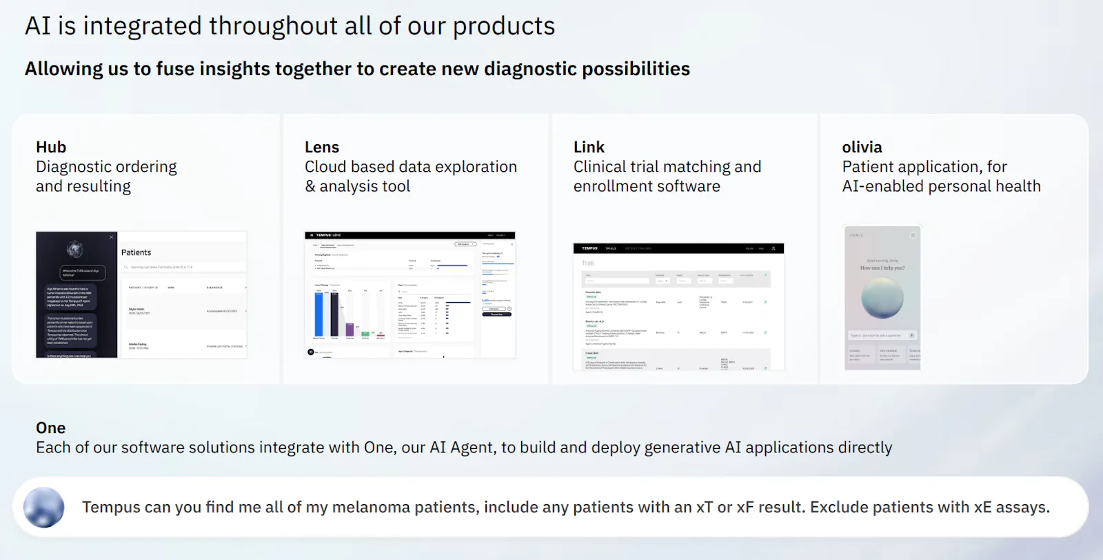 Das Unternehmen glaubt, dass diese Transformation zuerst in der Diagnostik stattfinden wird. Tempus AI nutzt KI, um klinische und molekulare Daten zu analysieren, um personalisierte Behandlungen zu ermöglichen, die Arzneimittelforschung voranzutreiben und eine frühere Krankheitsdiagnose erleichtern soll.