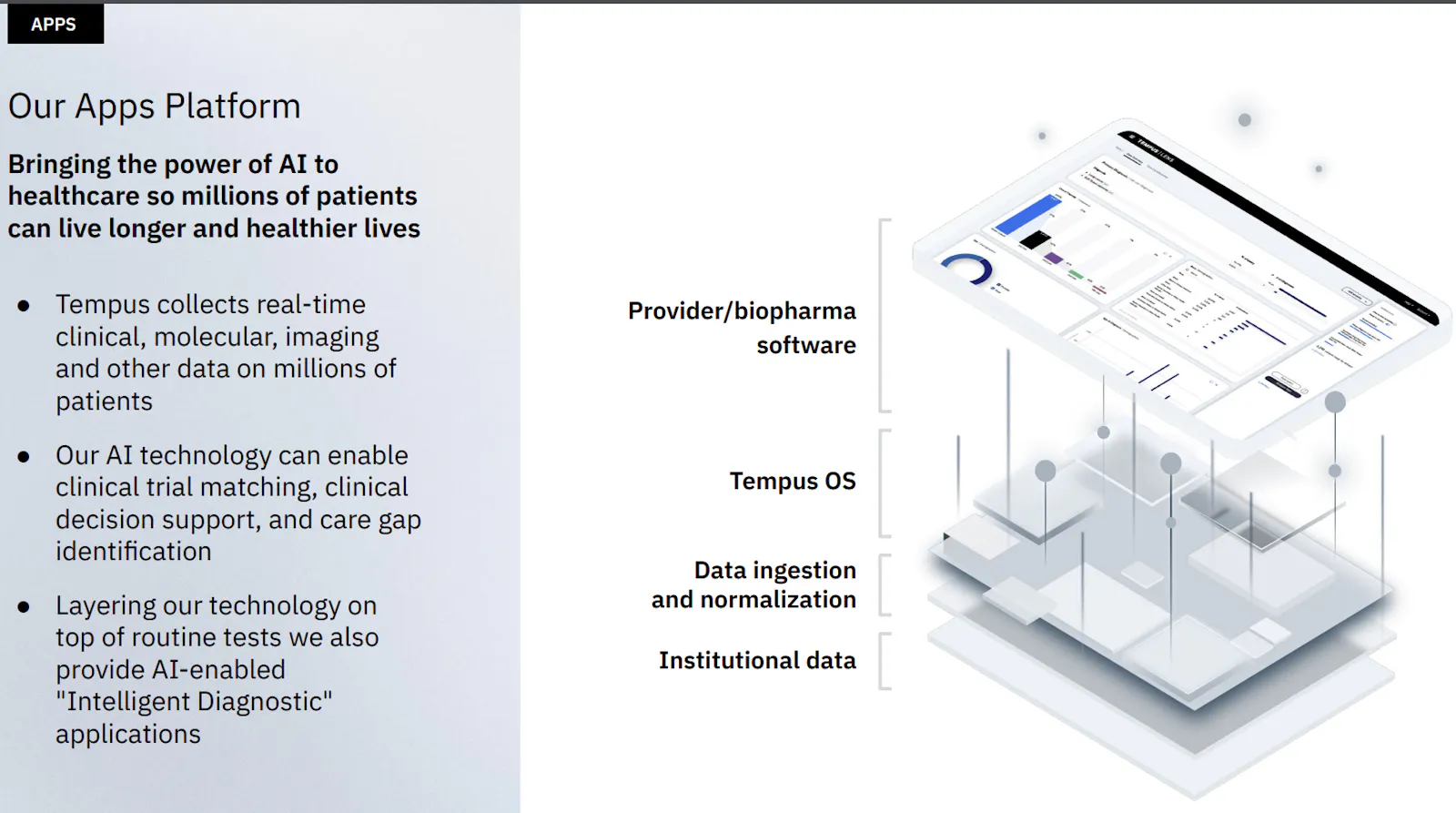Im Zentrum der Application-Plattform steht die Erfassung und Verarbeitung von Echtzeitdaten aus verschiedenen Quellen, darunter klinische, molekulare und bildgebende Daten, auf Basis von Millionen von Patienten. Mithilfe dieser Datenbasis bietet Tempus AI KI-gestützte Lösungen an, die unter anderem die Zuweisung zu klinischen Studien, die Unterstützung bei medizinischen Entscheidungen sowie die Erkennung von Versorgungslücken ermöglichen.