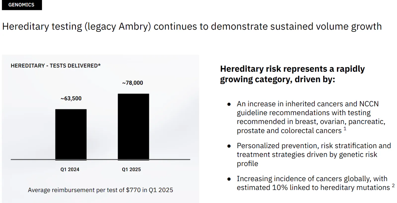Der Bereich erblich bedingter Gentests zeigt ebenfalls ein anhaltend starkes Wachstum. Im ersten Quartal 2024 wurden rund 63.500 Tests durchgeführt. Dieser Wert stieg im ersten Quartal 2025 auf etwa 78.000 Tests, was ein deutliches Plus im Volumen darstellt. Der durchschnittliche Erstattungsbetrag pro Test lag dabei im ersten Quartal 2025 bei 770 US-Dollar.