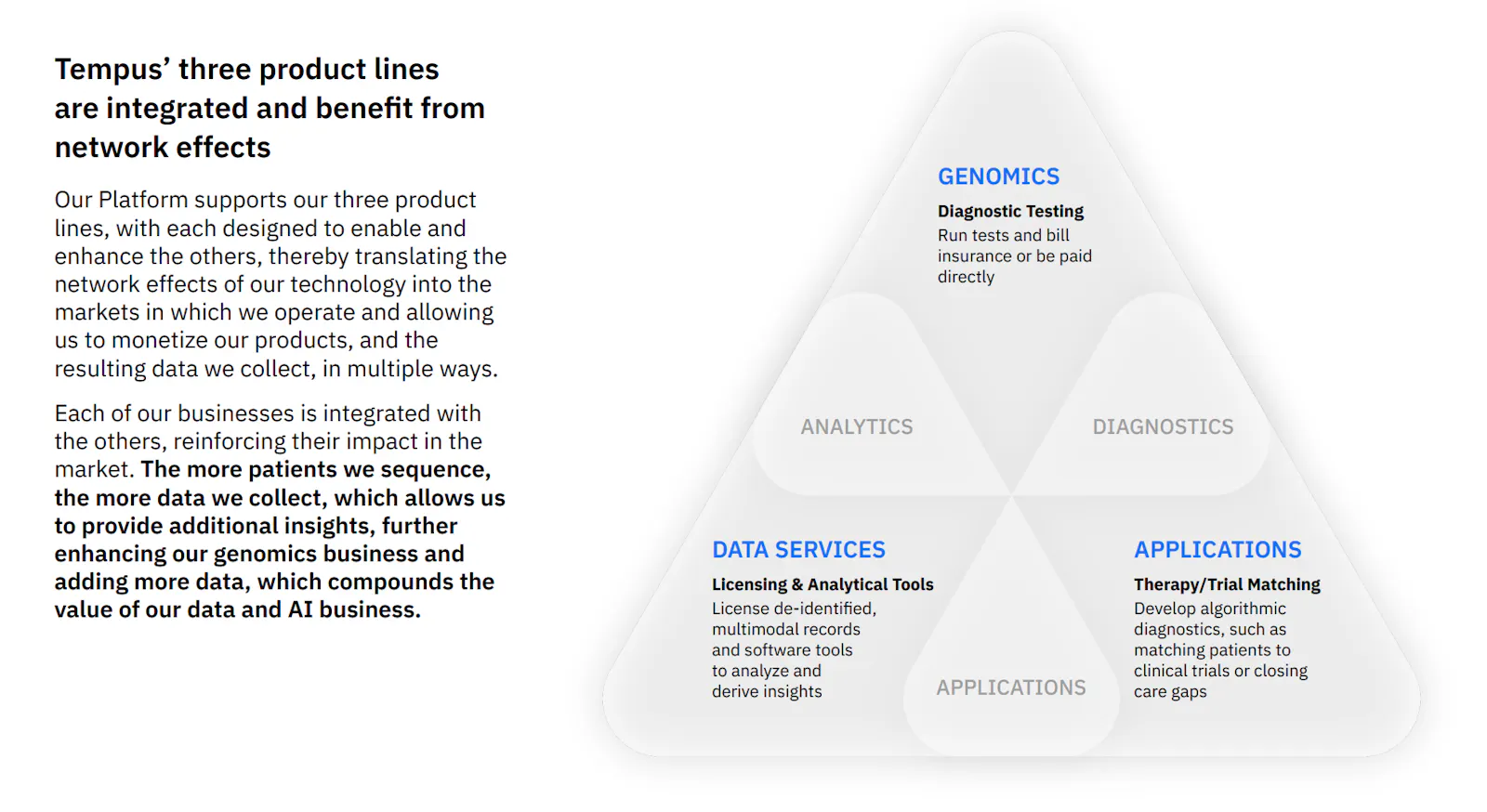 Tempus AI hat drei eng miteinander verknüpfte Produktlinien entwickelt, die sich gegenseitig verstärken und durch Netzwerkeffekte profitieren.