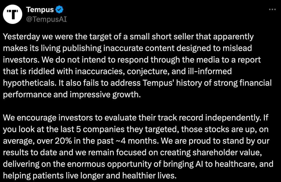 Tempus AI behauptet, dass der Short-Seller Bericht Anleger in die Irre führen soll. Das Unternehmen beabsichtigt außerdem nicht, über die Medien auf den Bericht zu reagieren, da dieser “voller Ungenauigkeiten, Vermutungen und schlecht informierter Hypothesen steckt”.