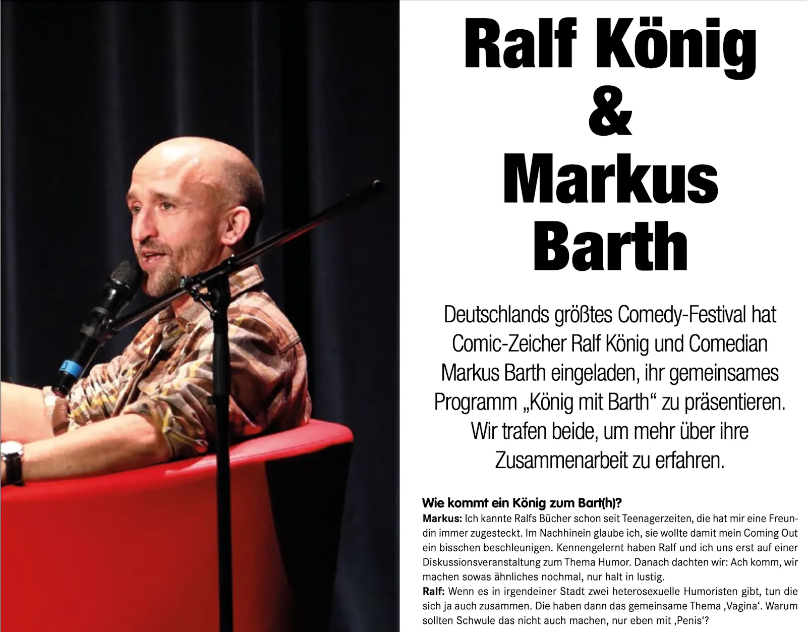 Gerade läuft das Cologne Comedy Festival und ich bin natürlich auch mit einer Show vertreten: Am 31.10. (ja, Halloween!) sind Ralf König und ich wieder mit unserer Zweiershow König mit Barth in der Kölner Comedia zu Gast (Tickets hier (Abre numa nova janela)). Passend dazu haben wir Schwulissimo ein großes Interview über unsere Zusammenarbeit, Humor und die Szene gegeben. Ab jetzt überall am Kiosk (und demnächst wohl auch online (Abre numa nova janela))