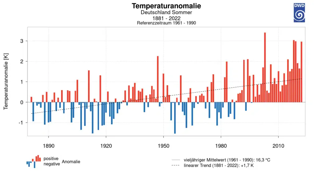 Ein Blick auf die Statistik der Sommertemperaturen (Abre numa nova janela) von 1881 bis 2022 zeigt, dass die im Artikel genannten Sommer tatsächlich recht warm waren. 1911, 1921, 1947 und auch die anderen genannten stechen deutlich aus den Temperaturen der umliegenden Sommer hervor.