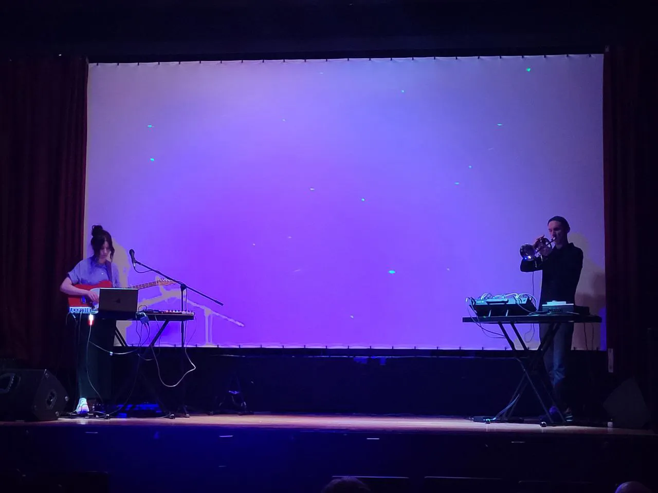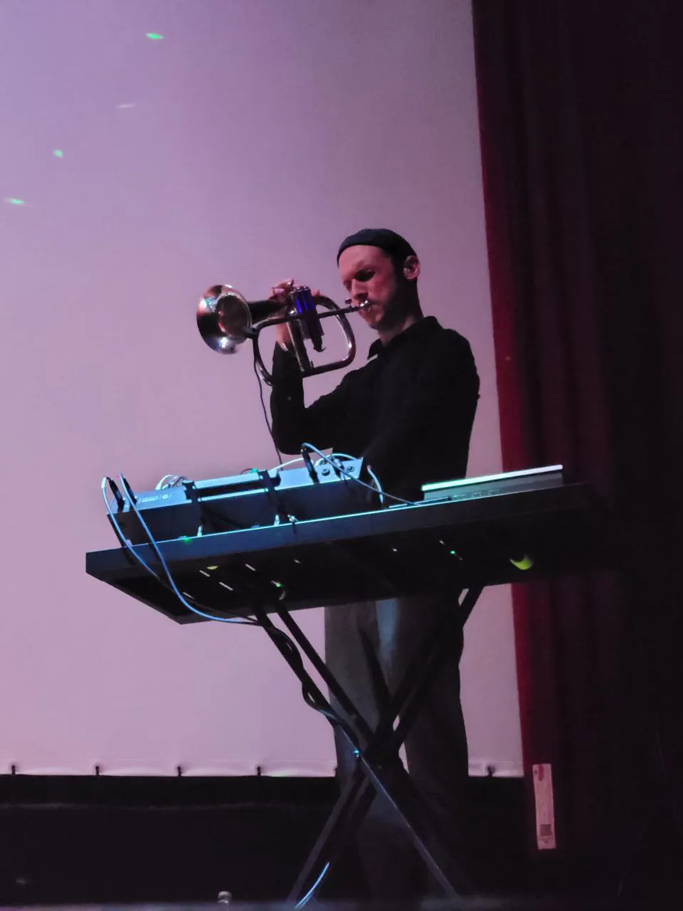 Die Besucher*innen konnten sich in die Kinosessel zurücklehnen, während ich mit Flügelhorn, Tape und Effekten raumgreifende Ambient Music spielte. Anschließend spielte GRAY ein Set mit Visuals und einem Musikvideo.