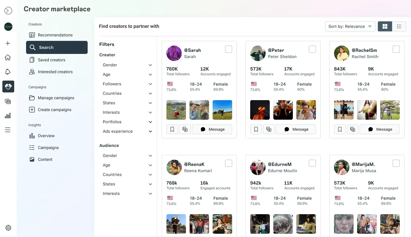 Dazu gibt es erweiterte Suchfunktionen, mit denen man nach bestimmten Eigenschaften filtern kann. Marken können direkt Kontakt aufnehmen oder ein Projektbriefing an mehrere Creators senden.