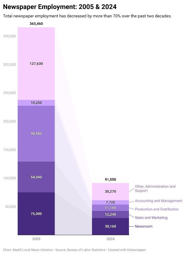 So sieht die Realität aus – bald wahrscheinlich auch in Europa: Etwa 91.550 Menschen waren im vergangenen Jahr in den Vereinigten Staaten in der Zeitungsbranche beschäftigt, ein Rückgang um 7 Prozent im Vergleich zu 2023. Seit 2005 sind mehr als 270.000 Arbeitsplätze verschwunden, ein Verlust von über 75 Prozent.