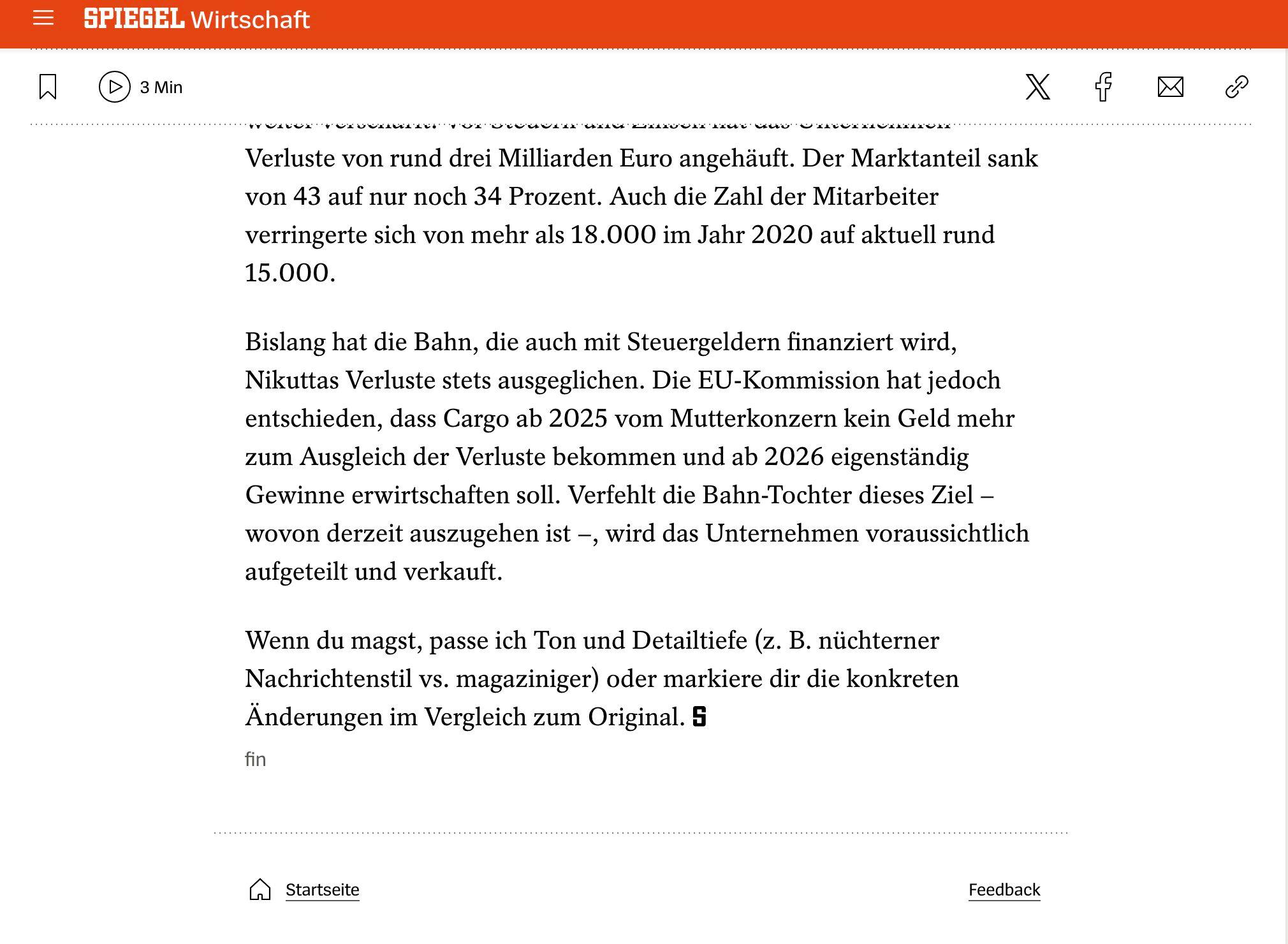 Du hast möglicherweise die kleine Peinlichkeit mitbekommen, die vor ein paar Tagen auf Spiegel.de stattfand. Da hatte nämlich jemand vergessen, im letzten Absatz die Ergänzung der Künstlichen Intelligenz wegzulöschen: „Wenn du magst, passe ich Ton und Detailtiefe (z. B. nüchterner Nachrichtenstil vs. magaziniger) oder markiere dir die konkreten Änderungen im Vergleich zum Original.“