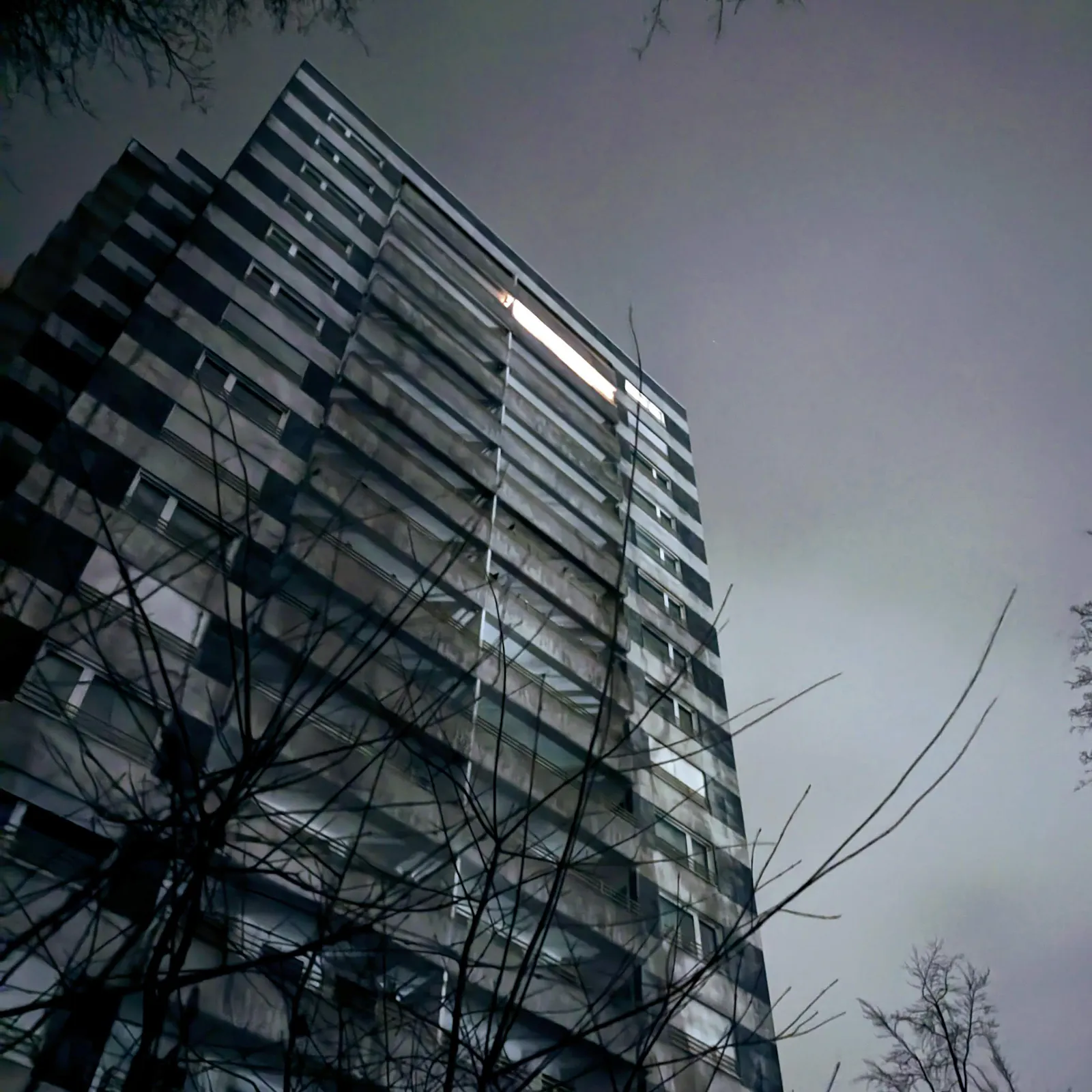 Ich ging also raus, der Hund hatte ziemlich genaue Vorstellungen davon, wo er hinwollte, und nach einer halben Stunde im strömenden Regen kamen wir wieder am Haus an, und beim Blick nach oben, sah ich Licht aus dem Schlafzimmer, machte ein Foto, und freute mich darüber, gleich eine wache Frau zu treffen. Als wir oben waren, der Hund abgetrocknet war und so weiter, blieb mir gar nicht die Zeit das zu erzählen, weil die Frau mir erzählte, dass sie sich freut, dass niemand von uns mit dem Hund fürs Kacken geschimpft hat.